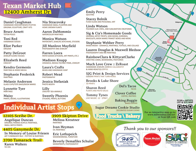 Milwood Art Day is spread around the Milwood/Walnut Crossing neighborhoods from a few central locations to individual artists’ studios. Find the map and list of participating artists below.