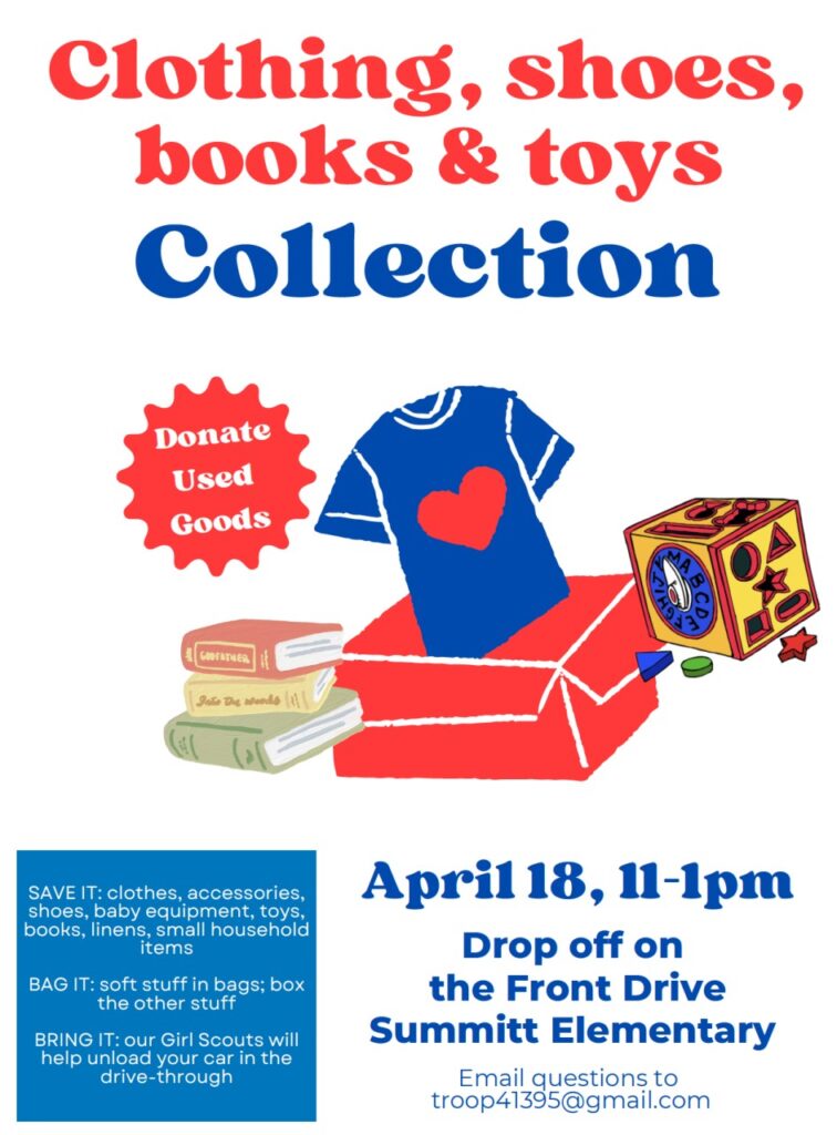 OR if you prefer you can just drop it off directly to the Girl Scouts’ Collection Event on Saturday, April 18 from 11am – 1pm.